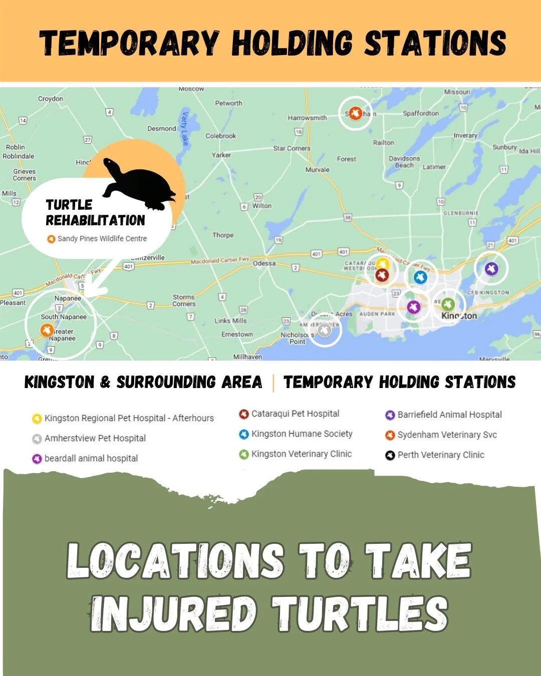 Contact Sandy Pines 613-354-0264 or the Ontario Turtle Conservation Centre (Peterborough) 705-741-5000