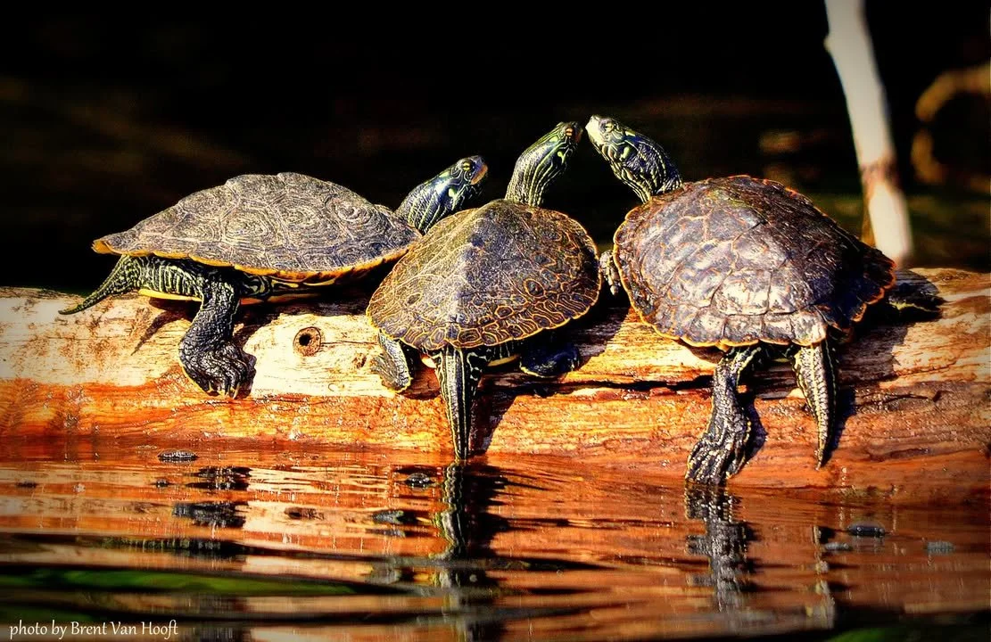 Three northern map turtles basking on a log. Photo taken by Brent Van Hooft