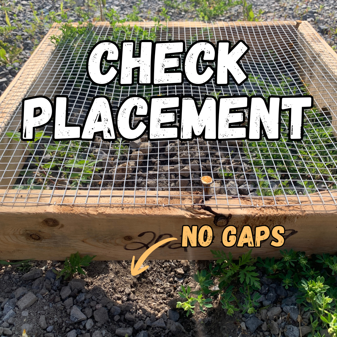 Remove any large stones or grass lumps from in front of the nest protector exit holes. Fill in or adjust the placement of the nest protector to ensure there are no gaps between the substrate and wooden frame.